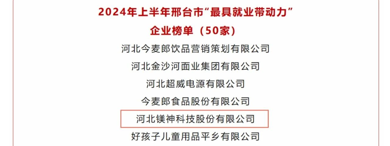 2024年7月15日 邢臺(tái)市人社局發(fā)布 邢臺(tái)市“最具就業(yè)帶動(dòng)力”企業(yè)榜單 河北鎂神科技股份有限公司榮譽(yù)上榜 ..熱線電話