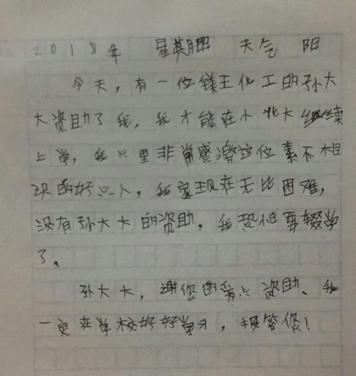 秋天是成熟收獲的季節(jié),在金秋飄香的日子里,董事長孫文先生又一次以誠摯的愛心溫暖了兩個貧困家庭。2020年9月16日,小辛莊村的紀某某和東召村的賈某某兩位學生,在縣領導的帶領下,來到了董事長孫文的辦公室。