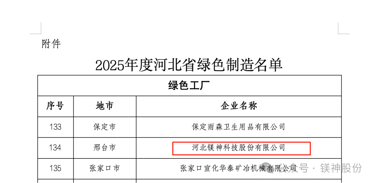 2025年9月8日,河北省工業(yè)和信息化廳正式公布了2025年河北省綠色制造名單。河北鎂神科技股份有限公司(以下簡(jiǎn)稱(chēng)“鎂神科技”)憑借在綠色制造、節(jié)能降耗、清潔生產(chǎn)等方面的突出表現(xiàn),成功入選“2025年度河北省綠色制造名單”!這是公司積極踐行綠色發(fā)展理念、扎實(shí)推進(jìn)綠色體系建設(shè)取得的重大成果,也是對(duì)鎂神科技綠色制造水平和可持續(xù)發(fā)展能力的認(rèn)可!