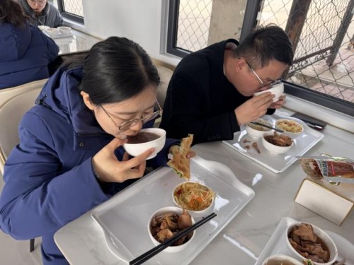 中午時分,食堂窗口前排起長隊。紅棗、紅豆、花生米、蓮子、糯米等十余種食材經過數小時熬煮,化作一碗碗熱氣騰騰的臘八粥迎接員工的到來。廚師們將臘八粥盛到每位員工碗中,員工們接過粥碗,笑容洋溢。